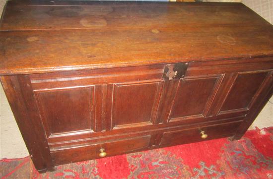 A GEORGE III OAK COFFER WITH TWO APRON DRAWERS, 140 X 72.5 X 58CM