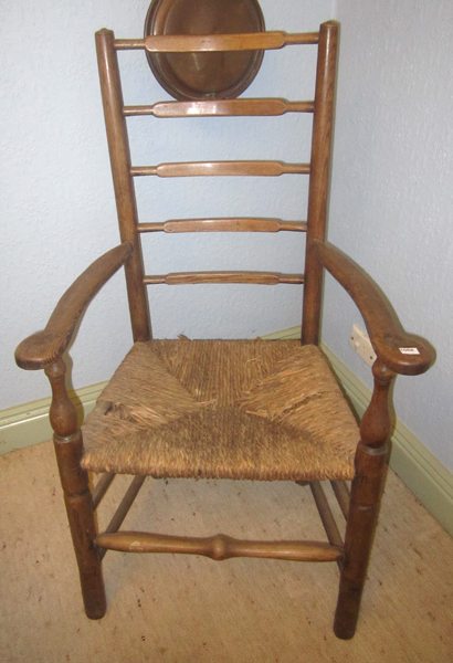 AN ENGLISH PROVINCIAL ELM LADDER BACK CHAIR WITH A RUSH SEAT