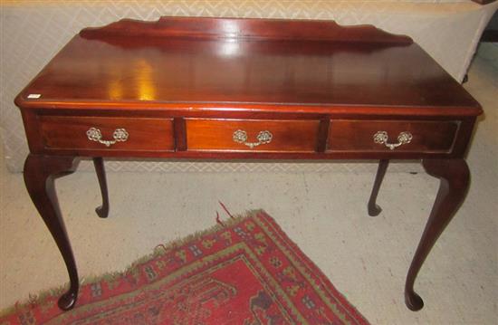 A QUEEN ANNE STYLE CABRIOLE LEG THREE DRAWER MAHOGANY SIDE TABLE, 115 X 74.5 X 50 CM