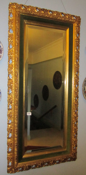 A RECTANGULAR GILT WOOD FRAMED BEVEL EDGED WALL MIRROR, 107 CM X 52 CM