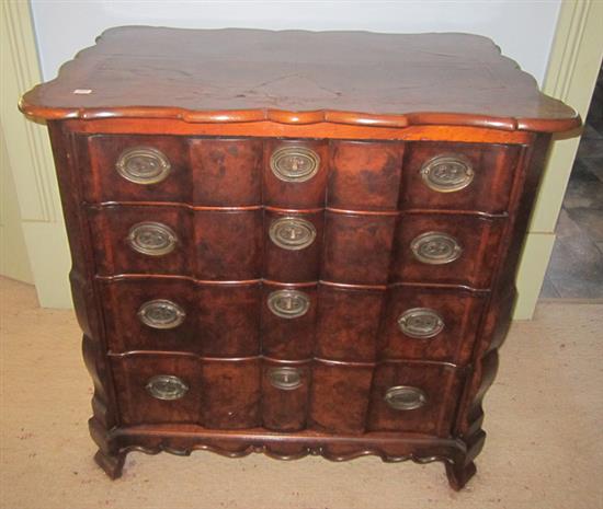 AN EARLY 18TH CENTURY CONTINENTAL BURR WALNUT VENEERED FOUR DRAWER CHEST, 85 X 82 X 58 CM