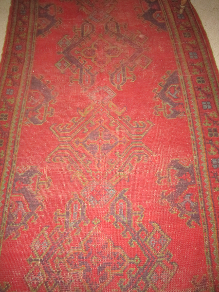 A RUG IN RED GREEN AND NAVY TONES, 290 X 136 CM