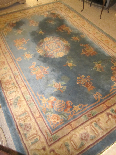 AN ART DECO STYLE CHINESE RUG ON A PALE BLUE GROUND