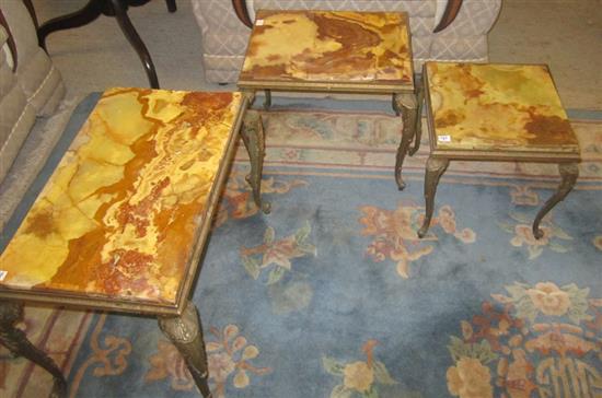 THREE BRASS BASED ONYX TOP OCCASIONAL TABLES (EACH WITH CRACKS AND REPAIRS TO MARBLE), THE LARGEST 54 X 41 X 36 CM