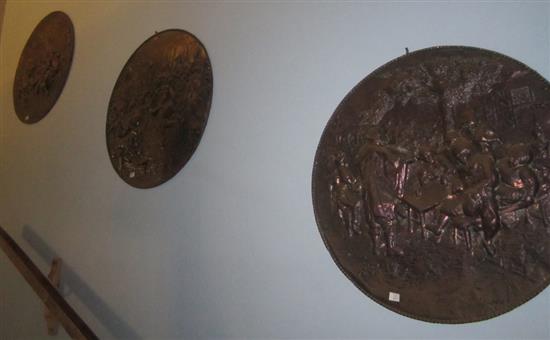A SET OF THREE EMBOSSED BRASS WALL PLAQUES DEPICTING TAVERN SCENES AND OTHER PASTIMES, 63 CM DIAMETER