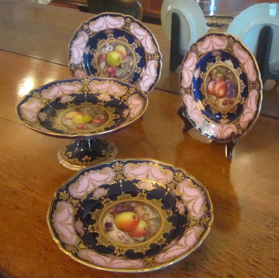 A ROYAL WORCESTER PORCELAIN PART DESSERT SERVICE, SIGNED R. SEBRIGHT, COMPRISING A COMPORT, TWO PLATES AND A DISH (EXTENSIVE REPAIRS, HAIRLINES) THE COMPORT 24CM DIAMETER X 12 CM HIGH
