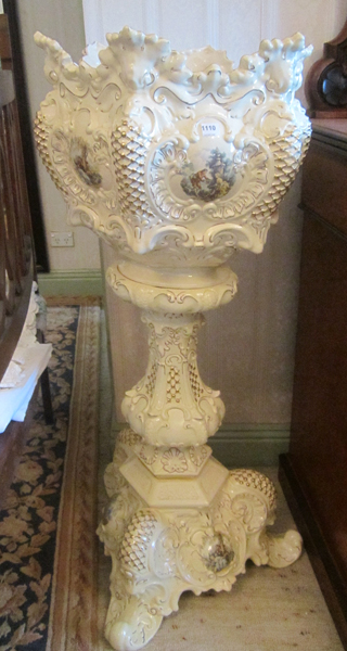 AN EDWARDIAN CERAMIC JARDINERE ON STAND, THE JARDINERE 41 CM HIGH, THE STAND 71 CM HIGH