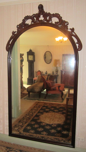 A ROUNDED RECTANGULAR MAHOGANY FRAMED PIER MIRROR WITH AN ORNATE FOLIATE CREST, 220 X 115 CM