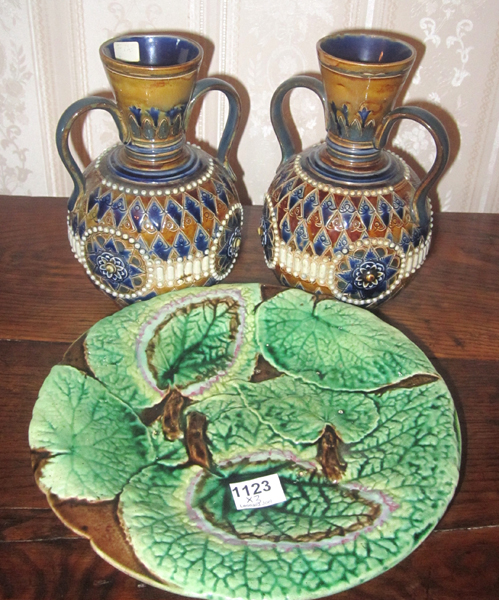 A PAIR OF DOULTON LAMBETH GLAZED STONE WARE VASES, 19.5 CM HIGH AND A 19TH CENTURY MAJOLICA COMPORT