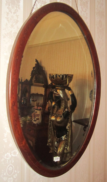AN OVAL MAHOGANY FRAMED WALL MIRROR WITH TUNBRIDGE WELLS INLAY, 77 CM HIGH