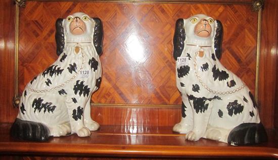 A PAIR OF STAFFORDSHIRE EARTHENWARE FIGURES OF SPANIELS, 25 CM HIGH