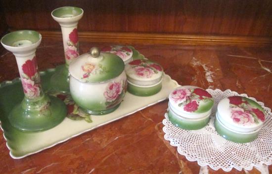 AN EDWARDIAN EIGHT PIECE CERAMIC DRESSING TABLE SET (CHIPS)