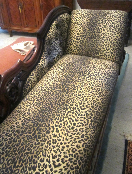 A VICTORIAN CEDAR FRAMED SINGLE ENDED CHAISE WITH LEOPARD PRINT UPHOLSTERY, 182 CM LONG