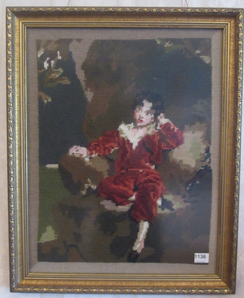 A MODERN NEEDLE WORK DEPICTING A YOUNG BOY IN A GILT FRAME, 42 X 33 CM