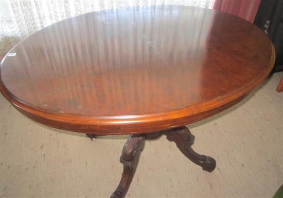 A VICTORIAN BURR WALNUT OVAL TOP TABLE WITH FOUR SCROLL LEGS 112 X 70 X 67 CM