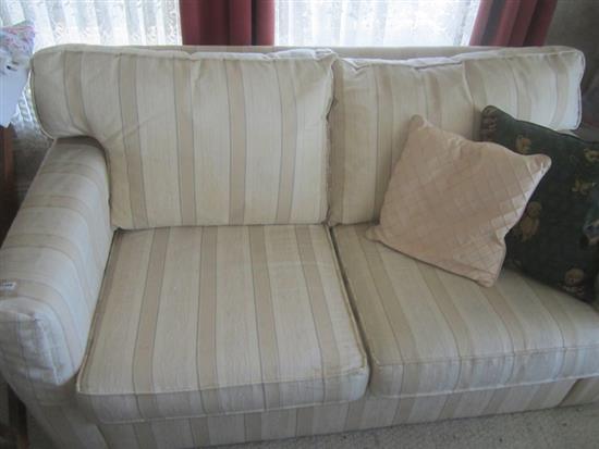 A MODERN TWO SEATER SETTEE WITH CREAM CLOTH UPHOLSTERY AND TWO LOOSE CUSHIONS