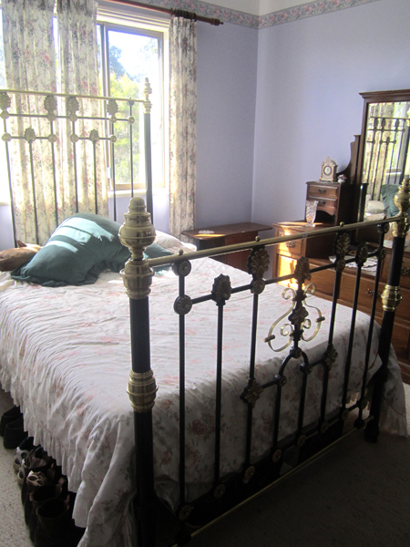 A VICTORIAN STYLE BLACK ENAMELLED METAL AND BRASS DOUBLE BED, 216 X 182 X 137CM
