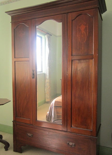 AN EDWARDIAN INLAID MAHOGANY SINGLE DOOR WARDROBE, WITH A CENTRAL MIRROR, 125 X 194.5 X 47CM