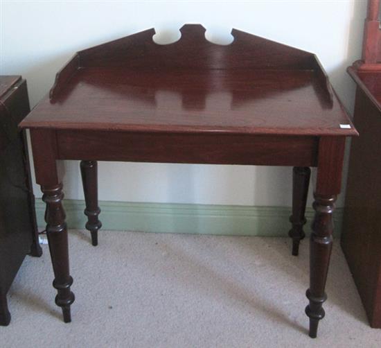 A 19TH CENTURY CEDAR RECTANGULAR TOP HALL TABLE WITH TURNED LEGS AND A SOLID SPLASH BACK, 92.5 X 92.5 X 48CM