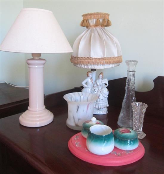 A COLLECTION OF GLASS AND CERAMICS INCLUDING A LAMP AND SHADE, A FIGURAL LAMP AND SHADE, THREE POTS, THREE GLASS VASES AND A CERAMIC PLAQUE