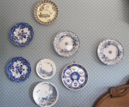 A COLLECTION OF TEN VICTORIAN AND LATER PORCELAIN CABINET PLATES, INCLUDING BLUE AND WHITE, THE LARGEST 26CM DIAMETER (SOME WITH CHIPS TO THE RIM)