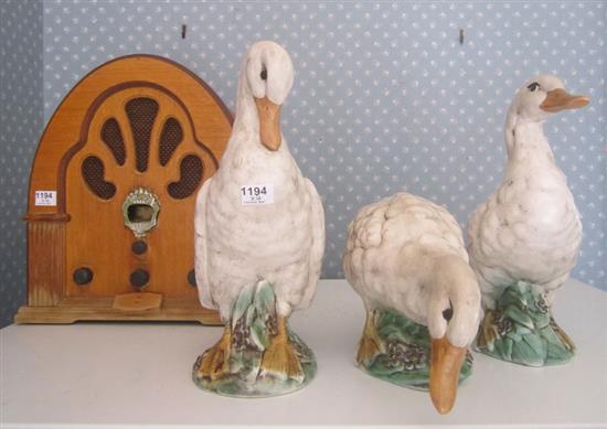 THREE CERAMIC DUCK FIGURES AND A VINTAGE STYLE RADIO