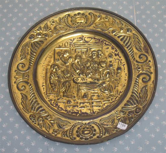 TWO EMBOSSED BRASS WALL PLAQUES, TWO BRASS WALL VASES AND A CERAMIC FRUIT PLAQUE