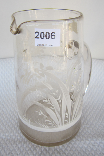 A 19TH CENTURY HAND PAINTED GLASS JUG, WITH APPLIED HANDLE, 18CM HIGH