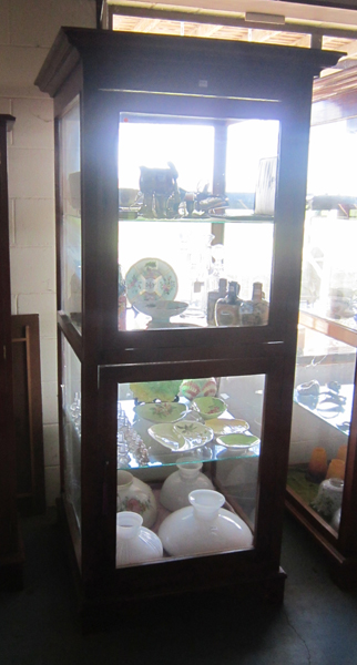 AN AUSTRALIAN TWO DOOR CEDAR DISPLAY CABINET WITH THREE GLASS SHELVES AND A KEY, 185 X 70 X 70, PANE OF GLASS BROKEN