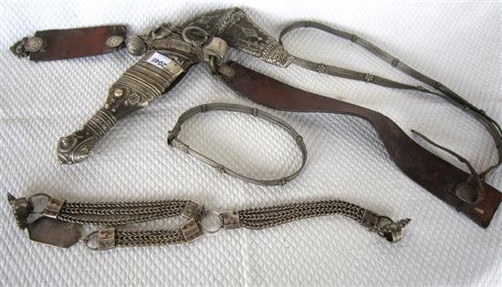 FOUR PIECES OF ARABIAN STYLE SILVER WARE, DECORATIVE DAGGER WITH SHEATH PENDANTS AND BELT