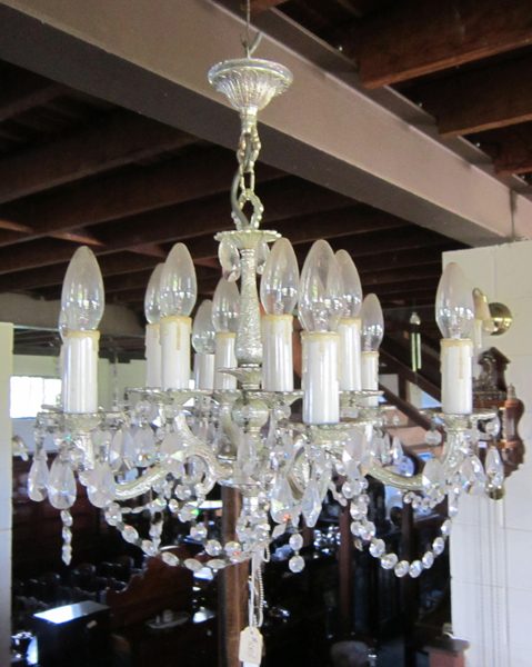 A TWELVE LIGHT HANGING CHANDELIER WITH A SILVERED FRAME, HANGING LUSTRES, 48CM HIGH
