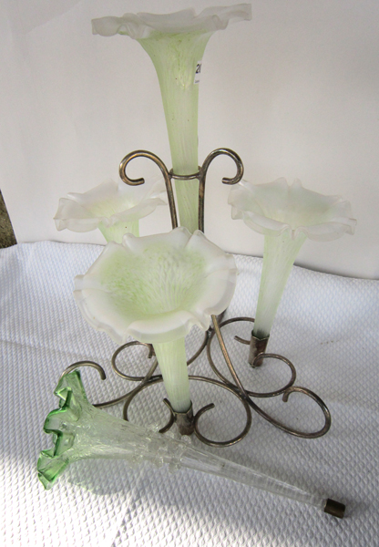 A 19TH CENTURY EPNS EPERGNE, WITH FOUR COLOURED GLASS FLUTES, 39CM HIGH, COMES WITH ANOTHER DIFFERENT STYLE FLUTE
