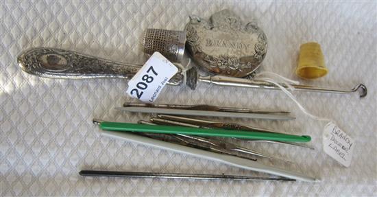 A SELECTION OF VINTAGE ITEMS, BRANDY LABEL, BUTTON HOOKS, THIMBLE ETC