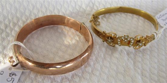 TWO 19TH CENTURY LADY'S GOLD BANGLES, ONE 15CT SWITH SEA PEARLS THE OTHER ROSE GOLD