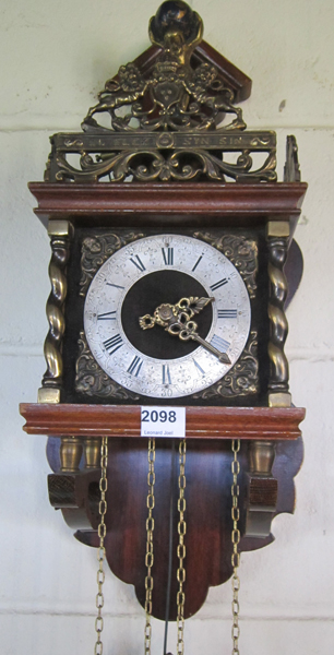 AN EARLY 20TH CENTURYDUTCH WALL CLOCK, WITH BRASS DECORATION, TWIN WEIGHTS AND PENDULUM