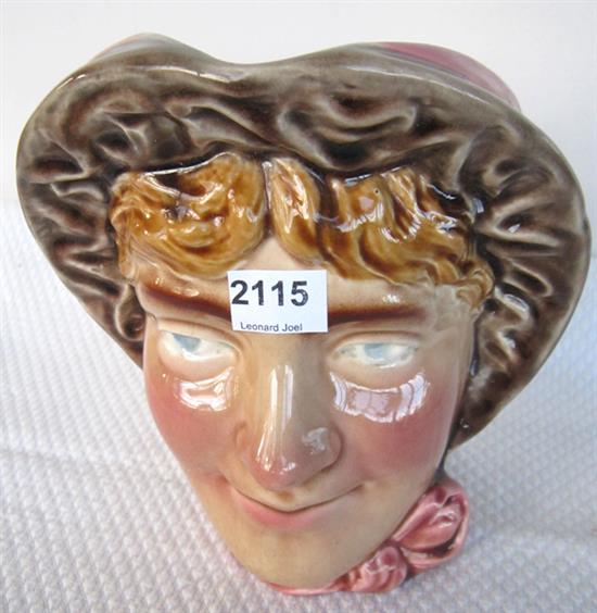 A FRENCH SARREGUEMINES CHARACTER JUG FACE OF A LADY, 18 CM HIGH