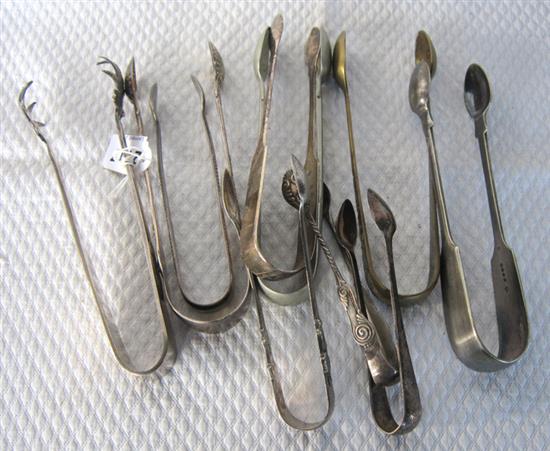 TEN EPNS SUGAR TONGS, SOME 19TH CENTURY