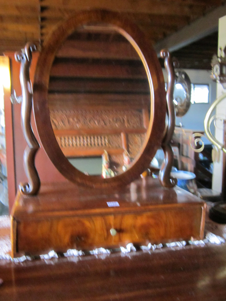 A 19TH CENTURY INLAID MAHOGAY DRESSING MIRROR, WITH SIGLE DRAWER OVAL MIRRORED WITH CARVED SUPPORT, 62 X 45 X 33