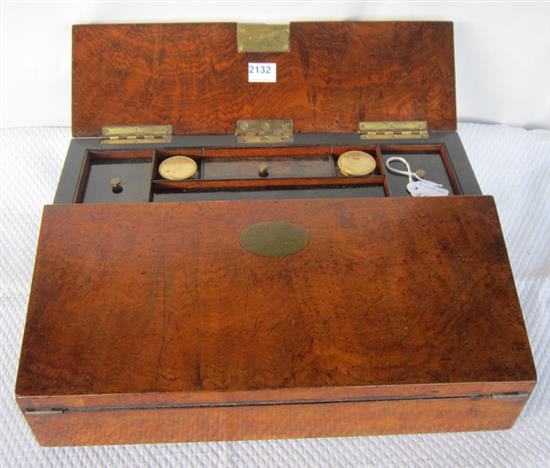 A 19TH CENTURY BIRDS EYE WALNUT WRITING SLOPE WITH FITTING INTERIOR, TWO INK BOTTLES WITH LIDS LIFT UP LID TO CENTRE COMPARTMENT, WHICH HOUSES A SECRET COMPARTMENT, KEY MISSING, 12 X 35 X 26