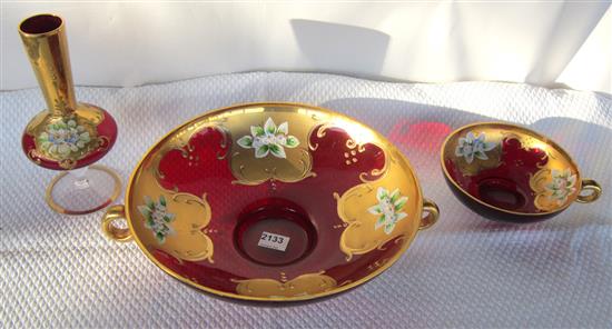 EIGHT PIECES OF VENETIAN RUBY GLASS, A SWEET SETTING AND VASE, WITH GILT WITH ENAMEL DECORATION