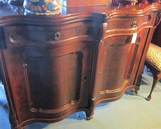 A 19TH CENTURY SERPENTINE ROSEWOOD SIDEBOARD WITH TWO DRAWERS OVER TWO CUPBOARDS, TWO KEYS, 99 X 136 X 56, SMALL LOSS TO ONE LOCK, BACK MISSING