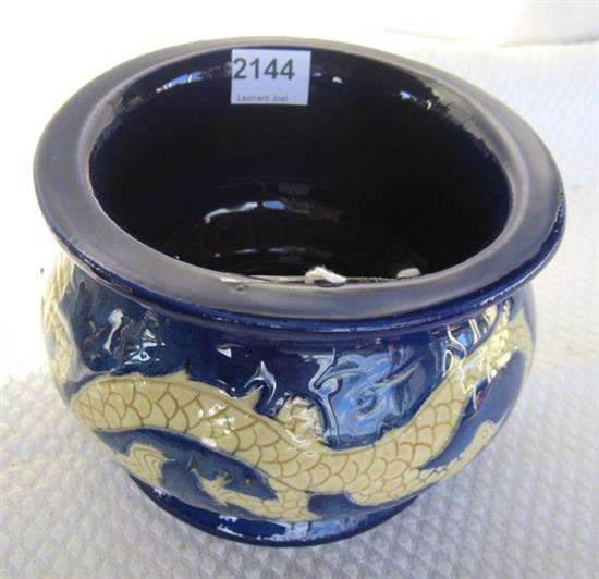 A 19TH CENTURY CHINESE BLUE CERAMIC GLAZED BOWL, WITH DRAGON DECORATION AND HIGH RELIEF CHARACTER MARK TO BASE, 16CM DIAMETER, SOME CRAZING TO BASE
