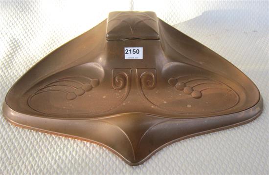 AN EARLY 20TH CENTURY ART NOUVEAU COPPER DESK SET WITH A GLASS INK WELL