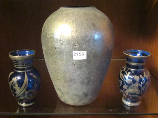 THREE PIECES OF GLASS WARE INCLUDING, STUDIO VASE AND TWO BLUE VASES WITH SILVER OVER LAID, TALLEST 24CM HIGH