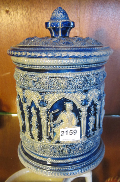 A CONTINENTAL STONEWARE LIDDED JAR, WITH DECORATION WITH HIGH RELIEF, 22CM HIGH