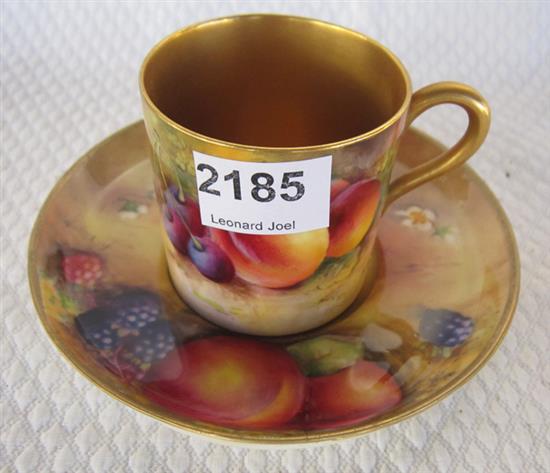 A ROYAL WORCESTER FRUIT DEMI TASSE, COFFEE CUP SIGNED H AYRTON, SAUCER SIGNED H EVERETT, OLDER RESTORATION TO SAUCER