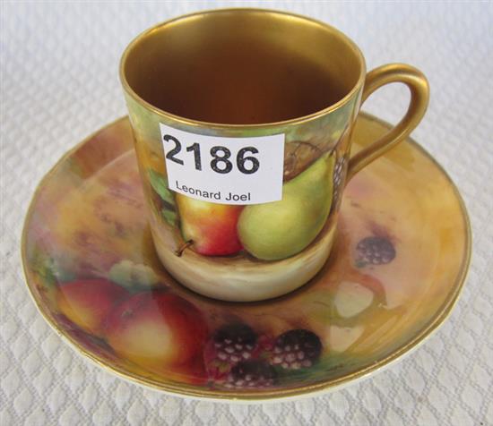 A ROYAL WORCESTER FRUIT DEMI TASSE, COFFEE CUP SIGNEDED H EVERRETT, SAUCER SIGNED E TOWNSEND, OLDER RESTORATION TO SAUCER
