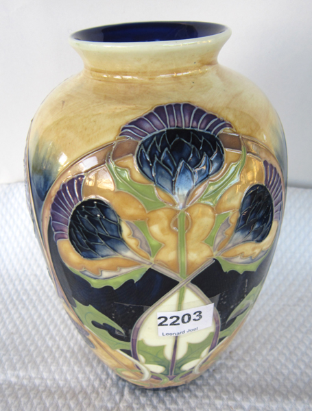 AN ENGLISH CERAMIC VASE STYLE OF MOORCROOFT, MAKER OLD TUPTONWARE, 20CM HIGH