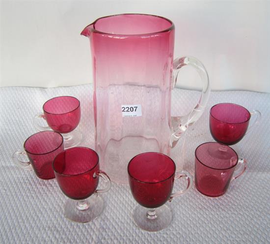 SEVEN PEICES OF 19TH CENTURY RUBY GLASS, SIX GLASSES, CUP AND JUG