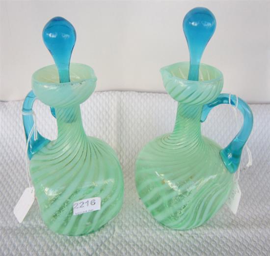 A PAIR OF 19TH CENTURY VASELINE GLASS JUGS, WITH HANDLES AND STOPPERS